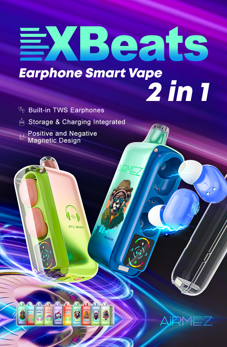 Az Airmez XBeat 40000 disposable vape akár 40 000 slukkot kínál egyetlen eszközben, 20 ml e-liquiddel és 1000mAh újratölthető akkumulátorral. A kettős mesh coil technológia gazdag ízt és sima gőzt biztosít, míg a LED kijelző segít nyomon követni az akkumulátor és az e-liquid szintjét. A készülék különlegessége a beépített HiFi TWS Bluetooth fülhallgató, amely lehetővé teszi, hogy zenehallgatás közben élvezze a vaping élményt.