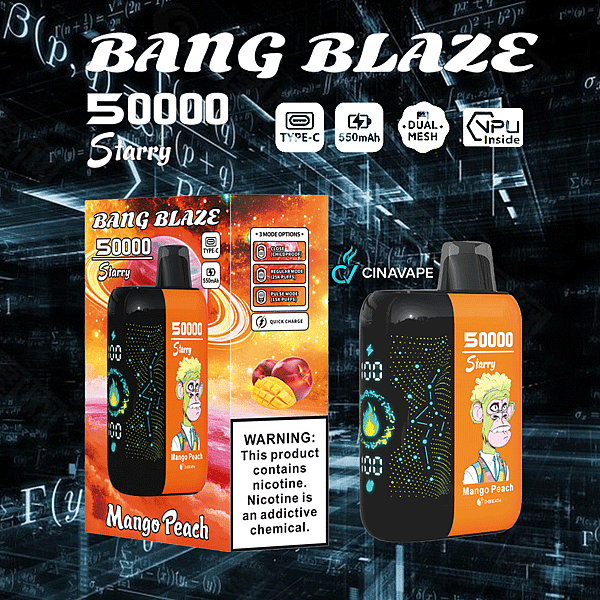 Fedezd fel a Bang Blaze Starry 50000 disposable vape készüléket akár 50 000 slukkal, LED kijelzővel, dupla mesh coil technológiával és három üzemmóddal. Hosszú élettartam, gazdag ízek és Type-C gyorstöltés.
